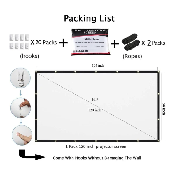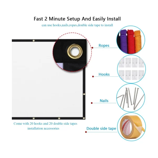 - EASY TO SET UP : The Projector Screen can be fastened easily with hooks, ropes, bracket, nails, double side tape on the wall/mount.