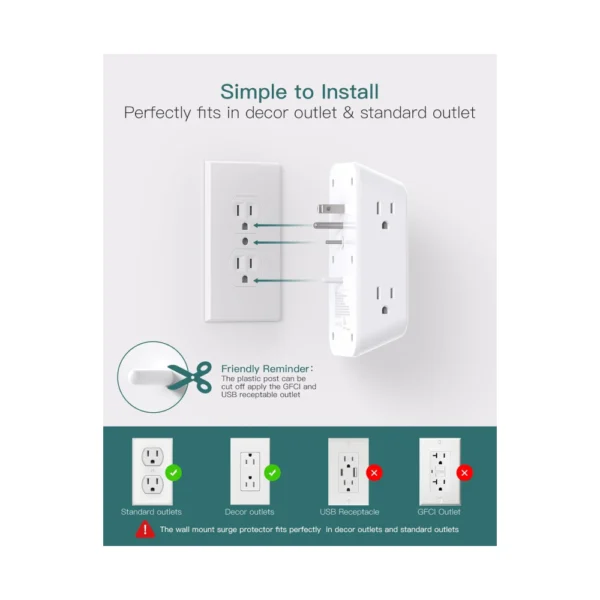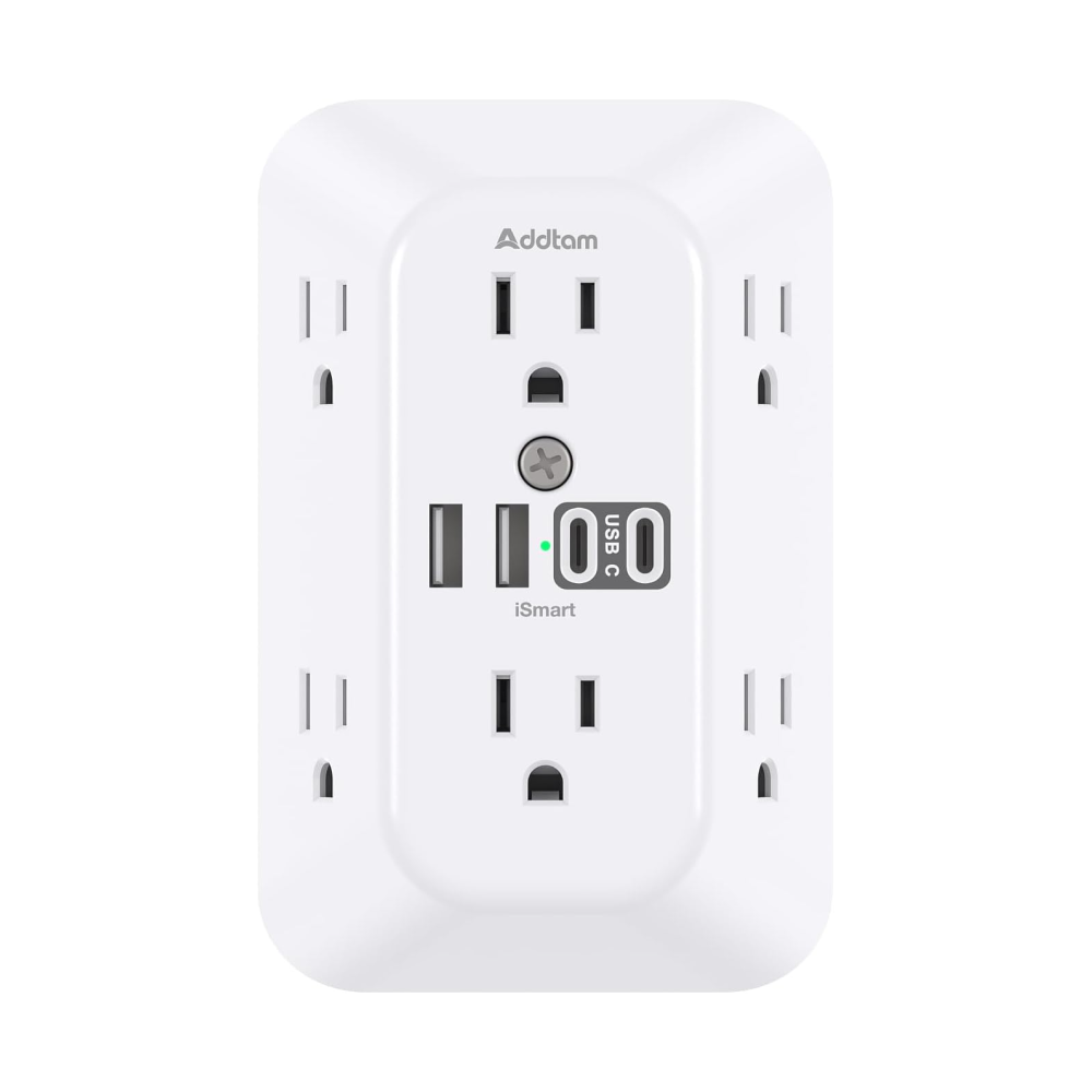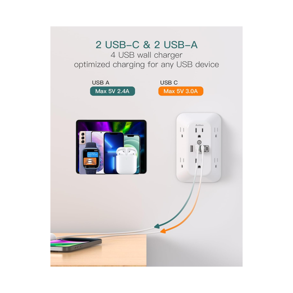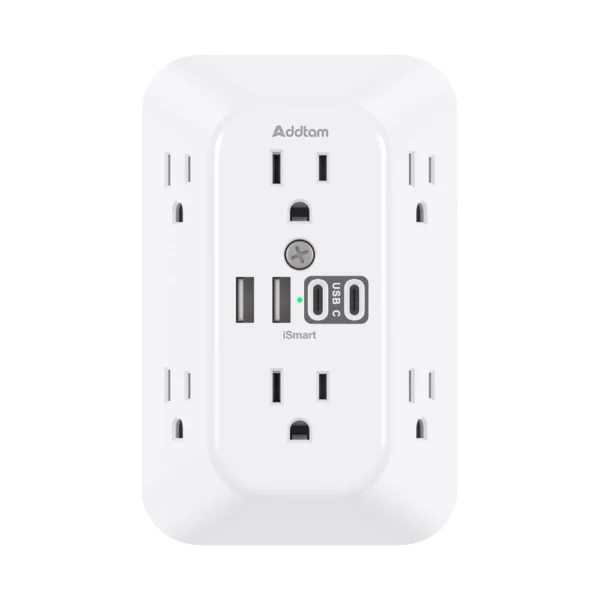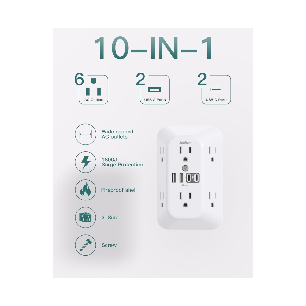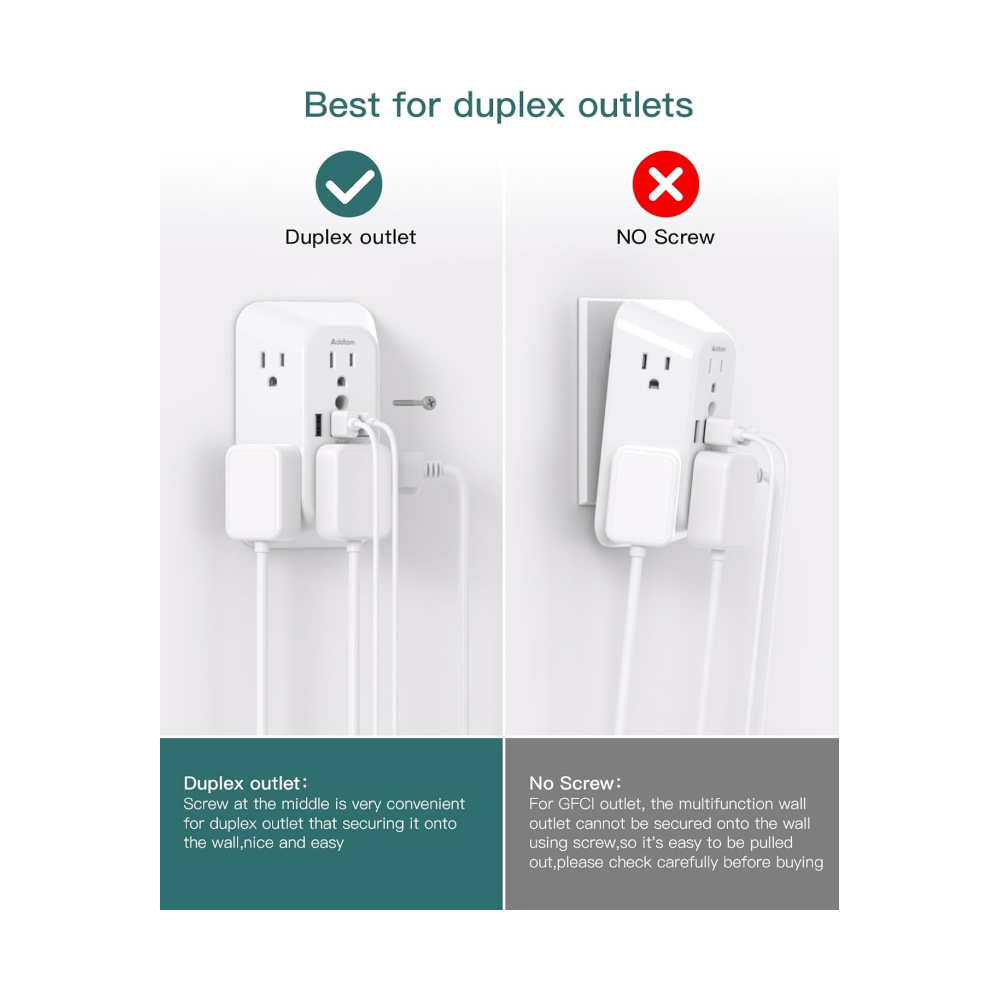 - 【10 in 1 USB Wall Outlet】- The outlet extender is fit duplex outlet perfectly, just plug in to use. You will get 6 AC outlets with the wide space in between and 4 USB ports(2 USB C), the screw at the middle and the plastic prong on back for fixing duplex outlet, you don’t worry about falling off. The outlet splitter can charge up to 10 electric devices simultaneously, is a perfect electrical equipment for your different needss