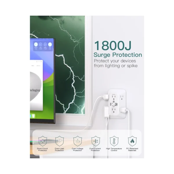 - 【1800J Surge Protector Outlet】- 3 level complementary Surge Protector Circuit which composed of TVS, MOV (metal oxide varistor), GDT (gas discharge tube), with minimum 1800J energy absorbing capacity, could protect your devices much more quickly and reliably than other brand’s 1 level MOV(metal oxide varistor) Surge Protection Circuits