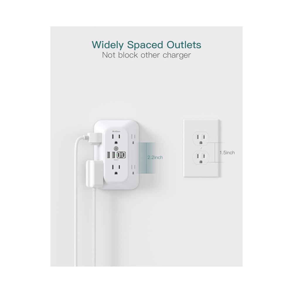 - 【Wide-Space Multi Outlet Plug】- 6 AC outlets with 2.2 inches long space in between, larger than standard 1.5-inch socket. Larger spacing makes it easier to use for all kinds of equipment, a must have accessories for travel, college dorm room, home, office, bedroom, kitchen and etc