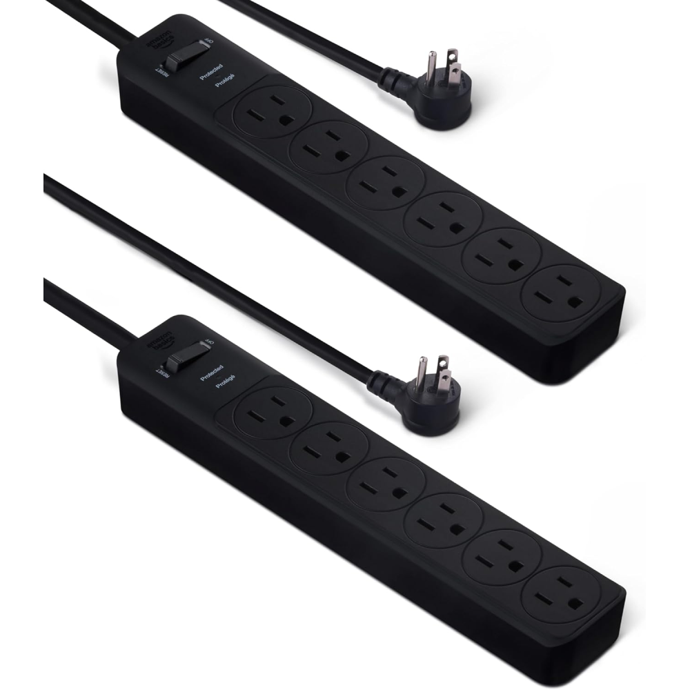Amazon Basics Rectangle 6-Outlet, 600 Joule Surge Protector Power Strip, 2ft, Black, Small, 2-Pack