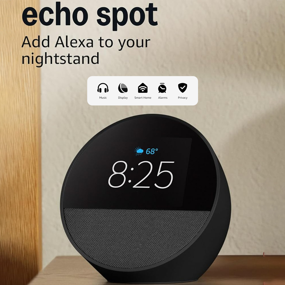 - MEET ECHO SPOT – A sleek smart alarm clock with Alexa and big vibrant sound. Ready to help you wake up, wind down, and so much more.