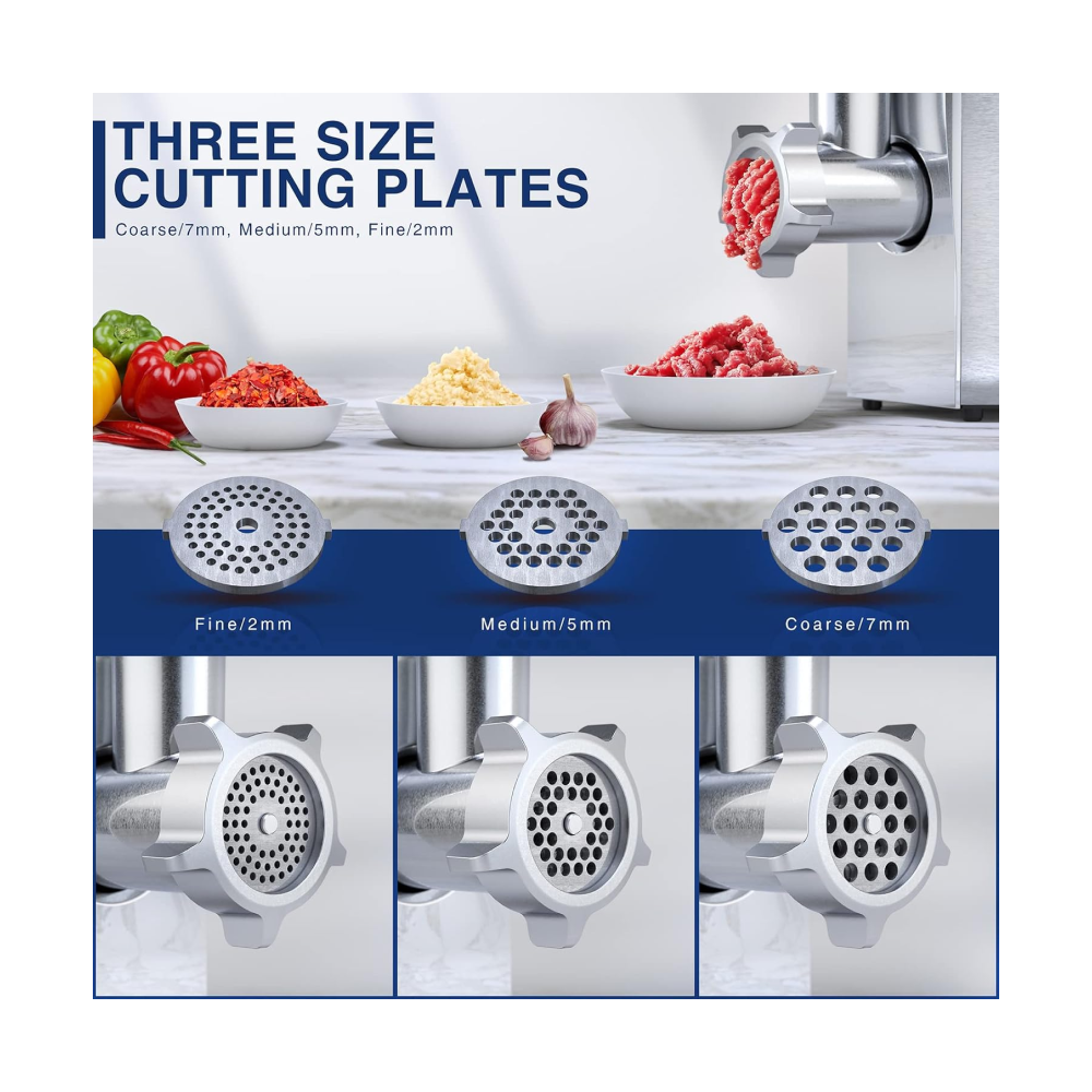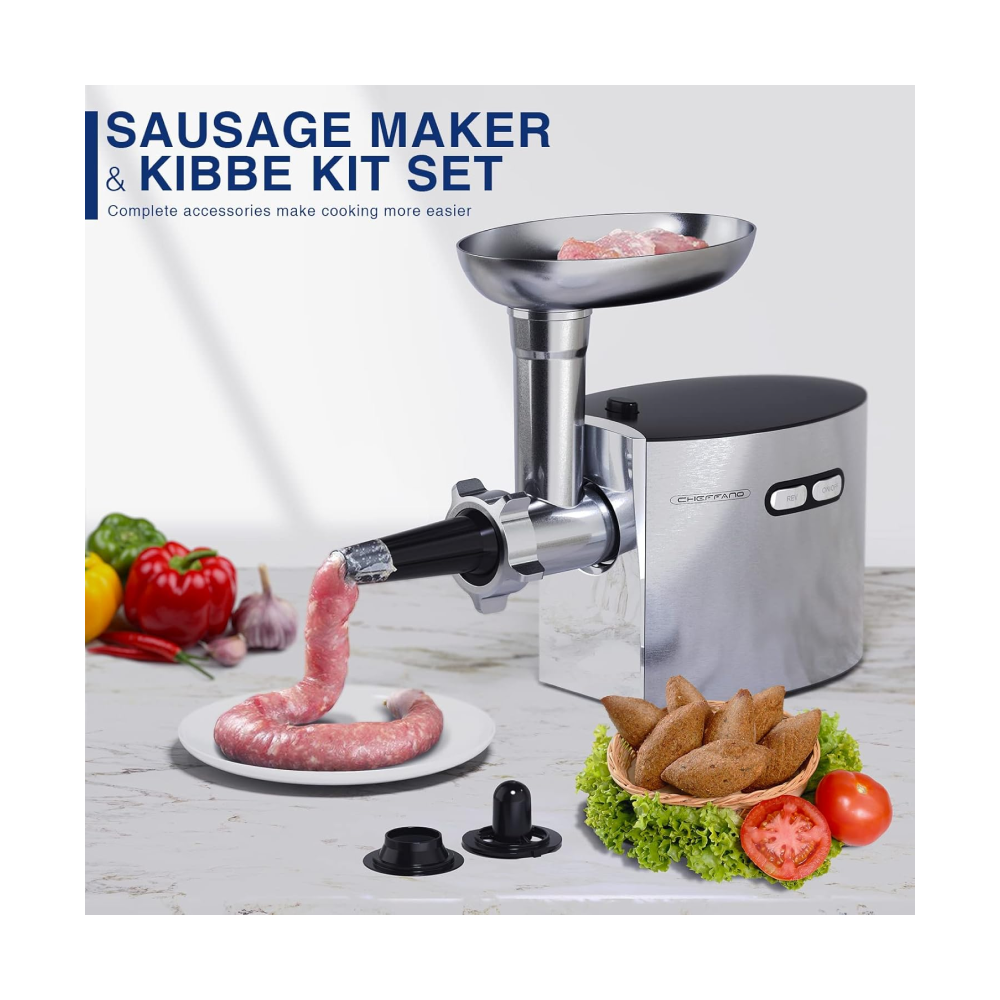 - [ETL Approved & Premium Parts] CHEFFANO electric meat grinder all have the owned the ETL safety certifications. It is including the 3 grinding plates (Diameter: 2mm/5mm/7mm), 2 blades, 1 food pusher, set of kubbe and sausage accessorices, which all made of food-grade material. After combining with different attachments, this heavy duty meat grinder can be work as meat grinder, sausage stuffer machine and kibbe maker to meet your daily needs.