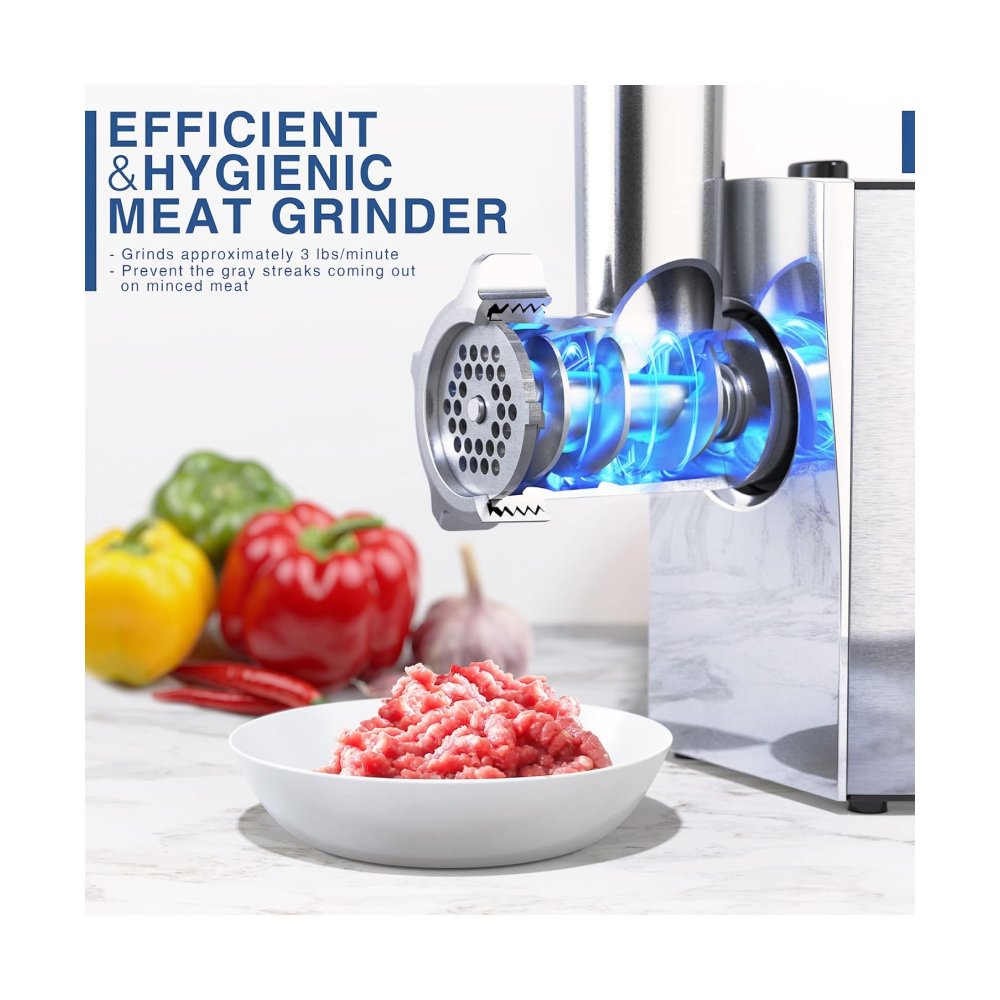 - [Auger Update] our kitchen home meat grinder is using the 3-layers auger pulls reduce the heat in grinding to lock the nutrition and prevent from storying the meat fiber. In this update, our food grinder as much as possible reduce the situabtion of the gray streaks coming out on minced meat. It not only ensure fresh of the ground meat but also Make you and your family healthier.