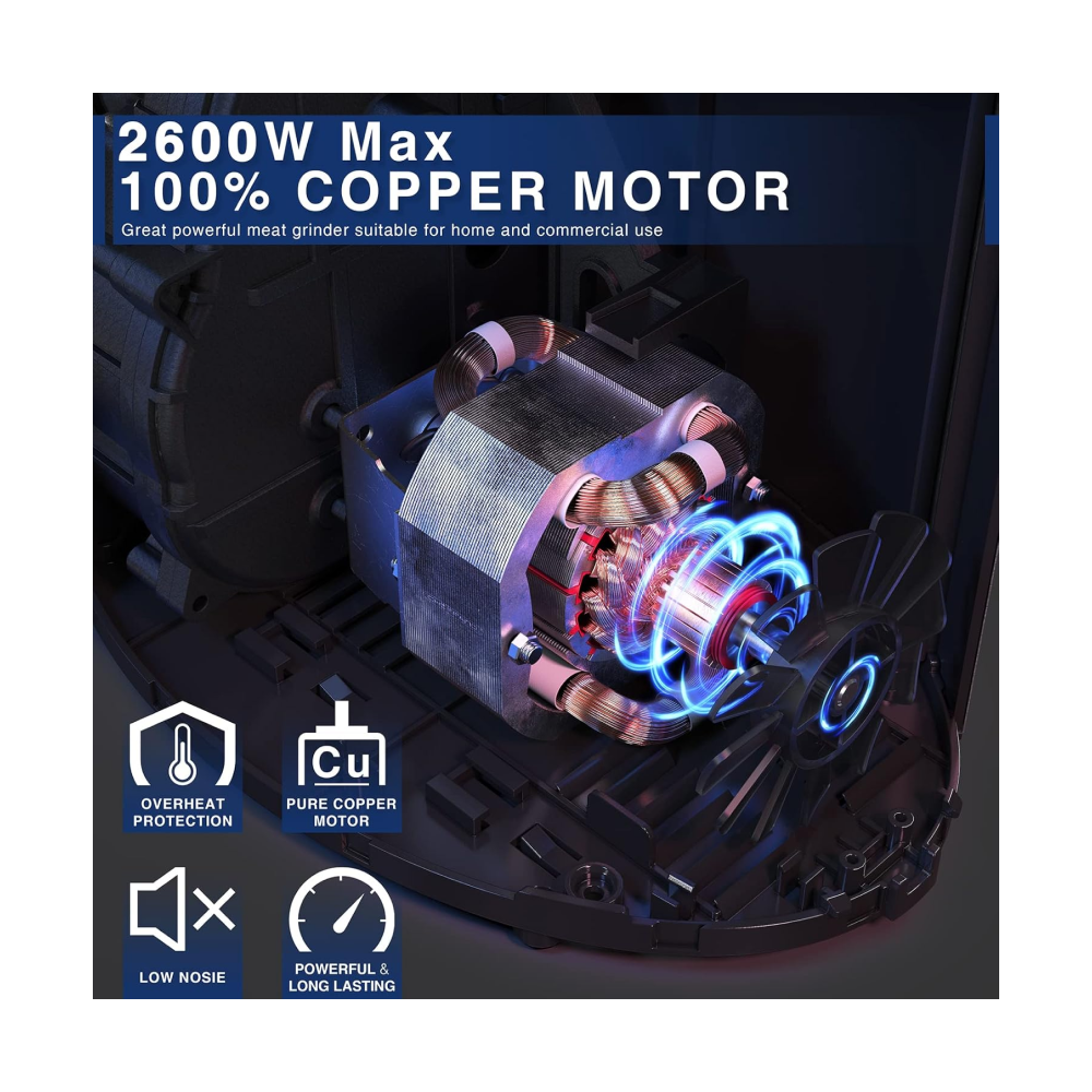 - [Powerful Motor] The meat grinder mechanical is using the 100% pure copper motor normal rated power up to 350W and the peak value can reach up to 2600 watt. Various meats and vegatables can be ground efficiently- opproximately 180 lbs meat/hour, great for saving your time and labor t grind it.