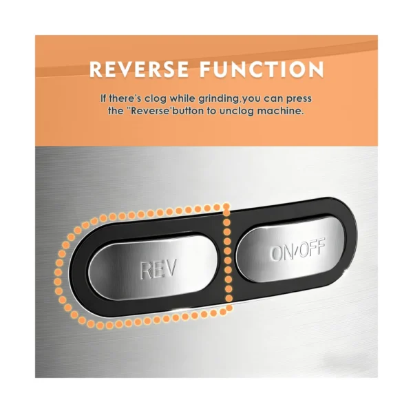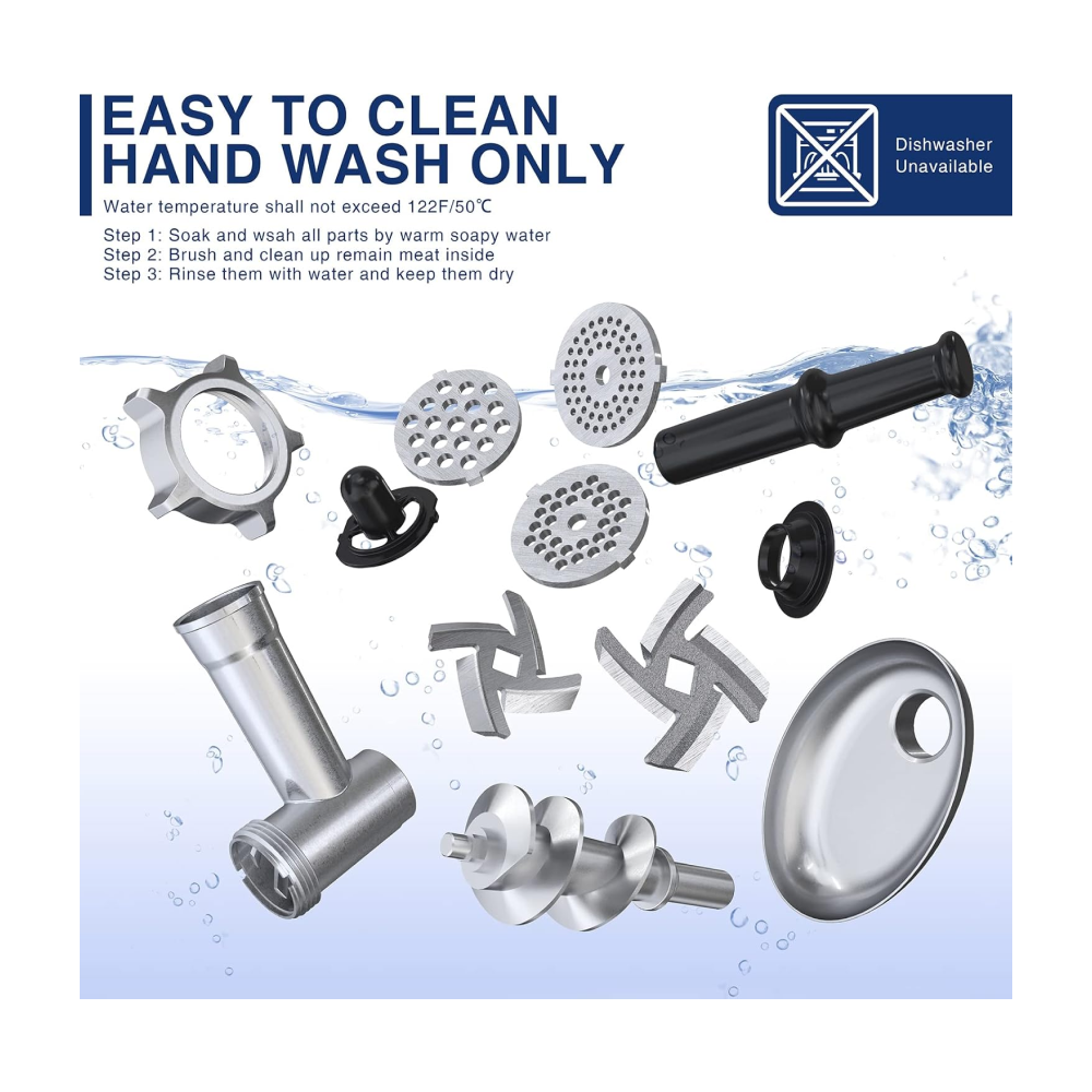 - [Use & Clean Instructions] Easy to operate – after assembling the parts, plug the power supply (Voltage–120V, Frequency–60 Hz ) and press the “on” button, and feeding the food. If something remained stuck, the “REV” button can unclog the unit easily. All parts can be removed and easy to clean. NOT DISHWASHER SAFE! We highly recommended washing the attachments buy hands with water (under 122°F or neutral detergent), and please keep them dry quickly with a towel.