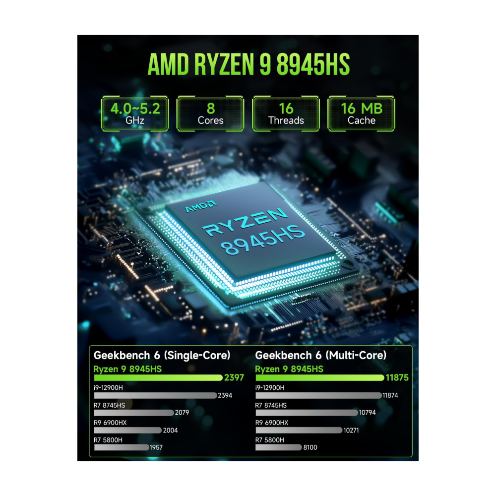 | CPU | AMD Ryzen 9 8945HS (8C/16T, Up to 5.20GHz, L2 8MB L3 16MB Cache) |