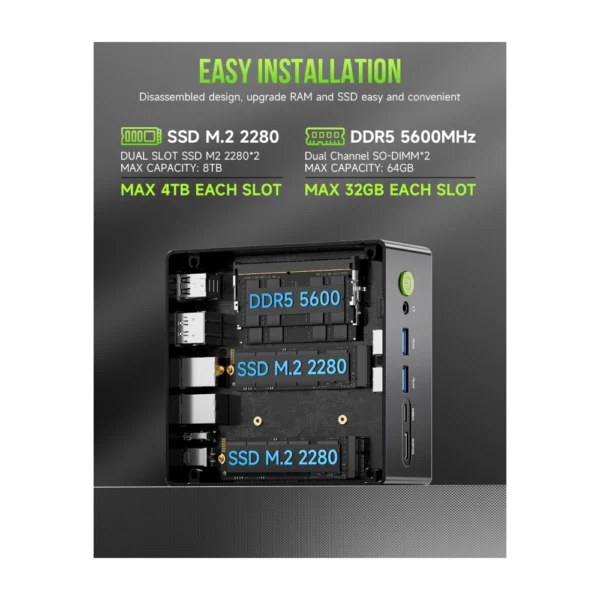 - 32GB DDR5 + 1TB PCIe 4.0 SSD – GMKtec K11 mini computers comes with 32GB(dual-channel) DDR5 RAM at 5600 MT/s , which can be expanded to 128GB and 1TB PCIe 4.0 M.2 2280 SSD supports dual PCIe Gen4 x4 SSD slots expanded up to 8TB, ensures lightning-fast read/write speeds