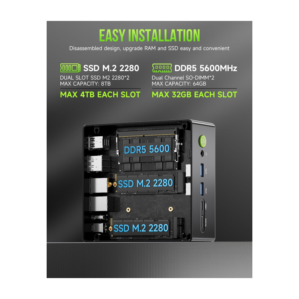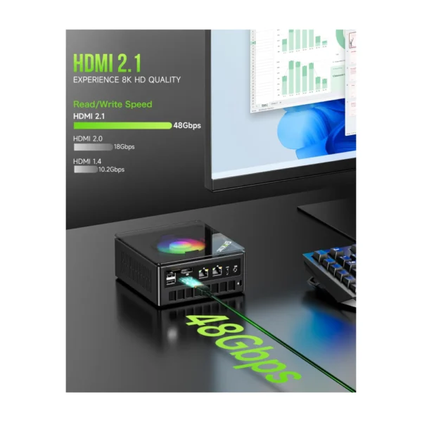 - 4-Screen 4K Display Support – K11 mini pc supports simultaneous 4K display output on 4 screens via HDMI 2.1 (4K@60Hz), DisplayPort 2.1 (4K@60Hz), and USB4 (up to 40Gb/s). Ideal for multitasking, it provides an immersive experience for professional work, gaming, and entertainment