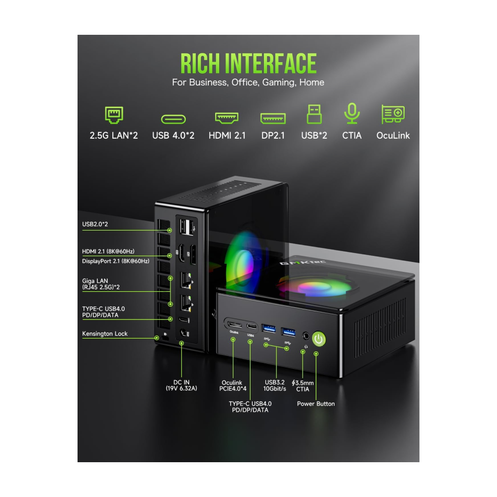| lnterface | 1* DC Jack Port; 1*Oculink Port; 2* USB 4.0 (PD/DP/DATA) Port; 1* HDMI 2.1 Port; 1* DP Port; 2* USB 3.2 Gen2 (10Gbps) Port; 2*USB 2.0 Port; 2* RJ45 (2500Mbps LAN) Port; 1* 3.5mm Audio Jack (HP&MIC) Port |