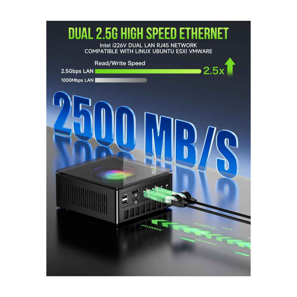 - Dual NIC Intel i226V 2.5Gbps + WiFi 6 + BT 5.2 – Dual Intel NIC 2.5G LAN port design provides more applications, such as firewall, multichannel aggregation, soft routing, file storage server, etc. WiFi 6 provides a faster internet experience for browsing, streaming and gaming. Built-in Bluetooth 5.2 is more stable and efficient to connect multiple wireless devices such as projector, printer, monitor, speakers and etc