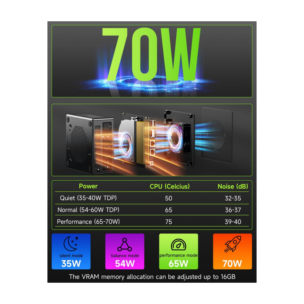 - Three Performance Modes & Updated UEFI (BIOS) – The K11 Mini PC features an all new BIOS update with three performance modes (Quiet 35W, Balance 54W, or Performance 65W). VRAM Allocation is also possible with Auto Power On, Wake-on-LAN options available