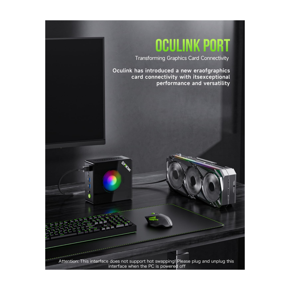 - Oculink Port – The Oculink port enables higher bandwidth capabilities, better frame rates and lower lag. The standard also operates at PCIe x4 speeds, compared to Thunderbolt’s x3. Gamers and content creators can benefit from Oculink’s higher bandwidth, resulting in better performance and lower lag for eGPU setups
