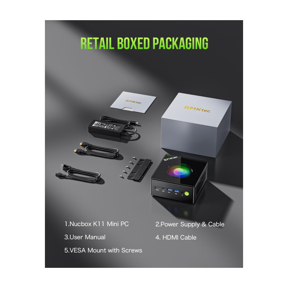 | Package Contents | 1 x GMKtec Nucbox K11 AMD Ryzen 9 8945HS Mini PC, 1 x Power Adapter, 1 x VESA Mount with Screws, 1 x HDMI Cable, 1 x User Manual |