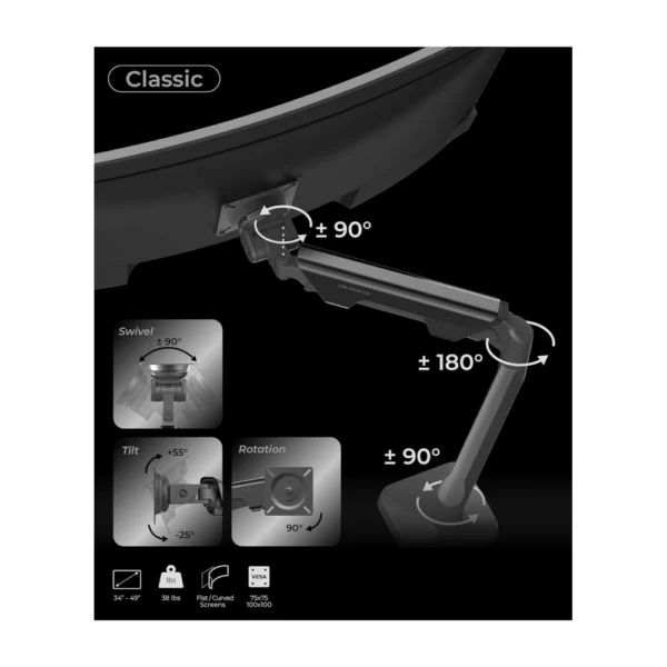 • Rock-Solid Hold for Ultra-Wide Screens: Securely supports 34″ to 49″ monitors (14-38 lbs), including Samsung Odyssey G9. No sagging, perfect for heavy curved displays
