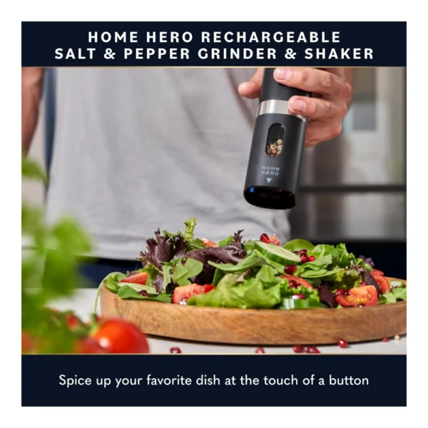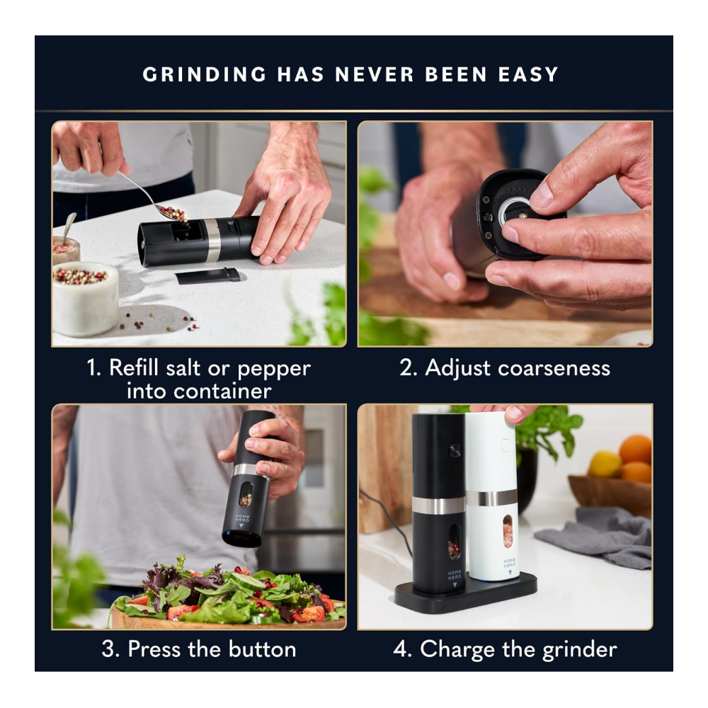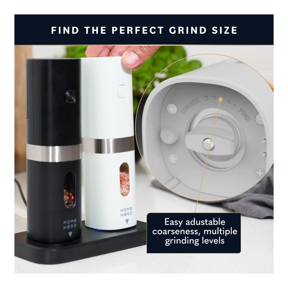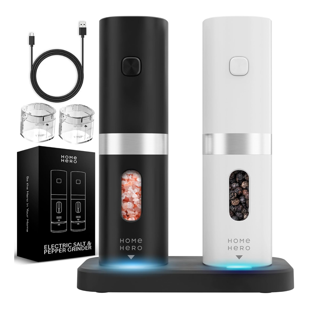 Home Hero Electric Salt and Pepper Grinder Set – Automatic Salt and Pepper Grinder Set Rechargeable. Electronic Salt and Pepper Shakers with LED Light, Electric Pepper Grinder & Salt Grinder, Set of 2