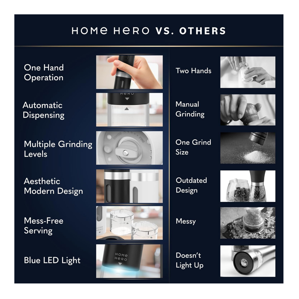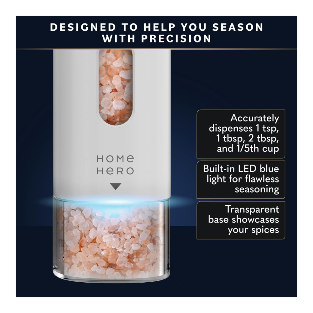 - Easy One-Handed Operation – The Home Hero salt and pepper mill grinder has a built-in blue light that illuminates the grinding process to ensure precise seasoning. The one-handed operation with a simple button start also makes it easy to use for those with limited grip strength.