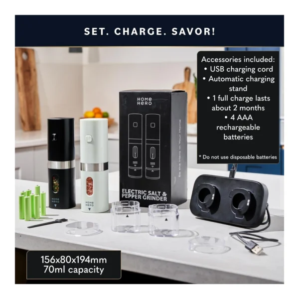 - USB Rechargeable Salt Grinder – Automatically recharge this electric pepper grinder refillable with the included USB charging stand, or if you’re on the go, with the four included AAA batteries. With about two months of usage time on a single charge, it’s convenient and cost-saving.