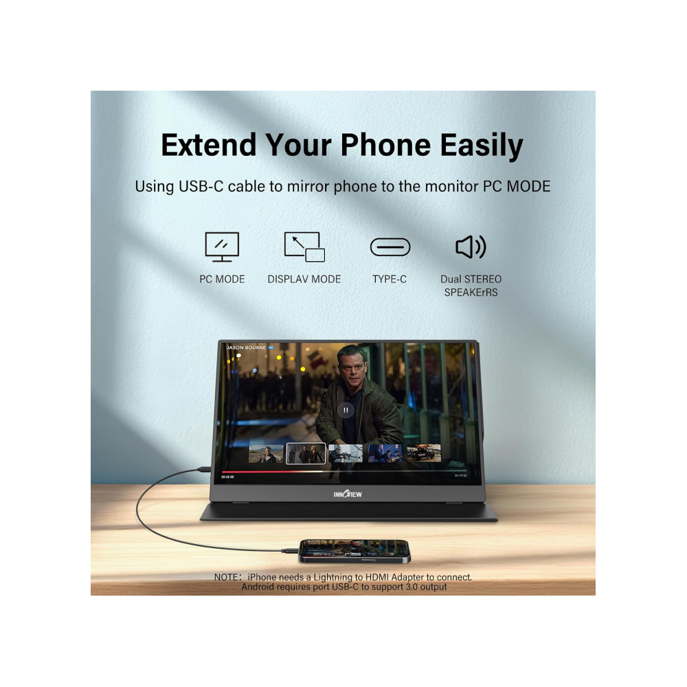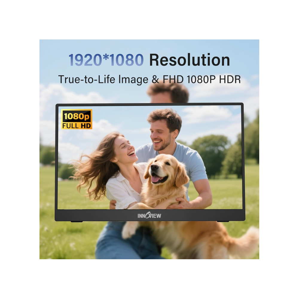 - [Portable Monitor Laptop] InnoView laptop screen extender is no need of app and drivers! 15.6 in is a more suitable size for traveling or remote work. Suitable for traveler, student, gamer, engineer, and white-collar worker to connect HP laptop, Lenovo laptop, Dell laptop, Asus laptop, Macbook, iPhone, game console, tablet, PS, Xbox, etc. The laptop screen can expand the viewing area and be more efficient when playing games, working, meeting and studying