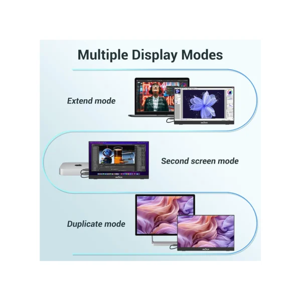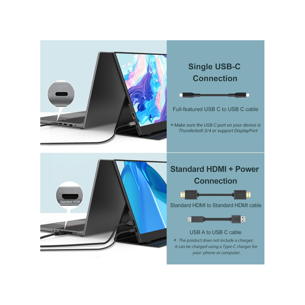 - [Plug and Play] The travel monitor for laptop provides 2 full-function Type-C ports and 1 HDMI port to connect most devices. Only one USB-C cable is needed to connect the external display to computer, and it supports power pass-through reverse charging. Note: Your device should support Thunderbolt 3.0/4.0 or USB 3.1 Type-C DP ALT-MODE. If not, you can connect via HDMI and power cable(NOT INCLUDE IN THE PACKAGE)