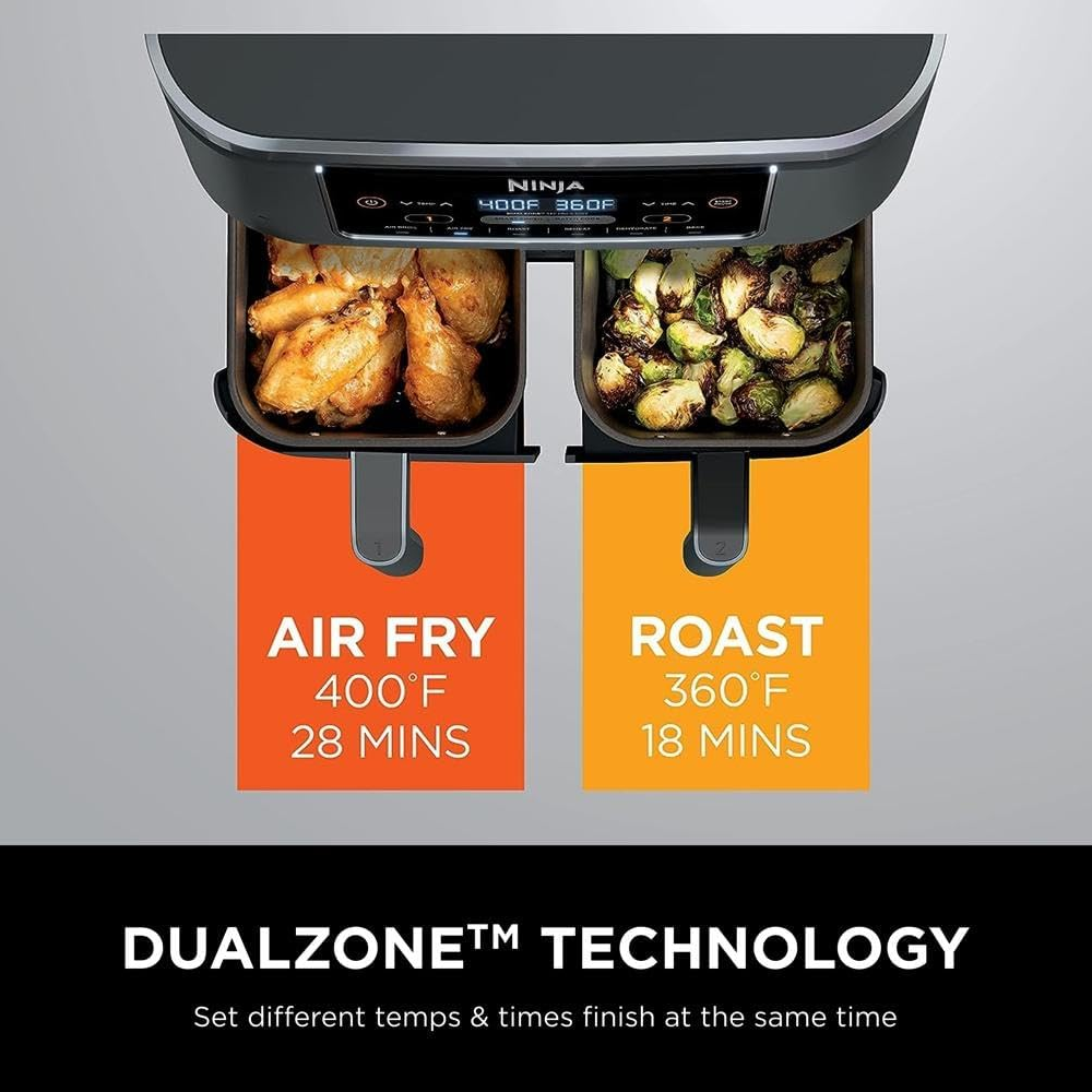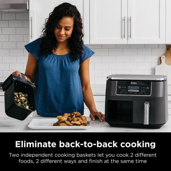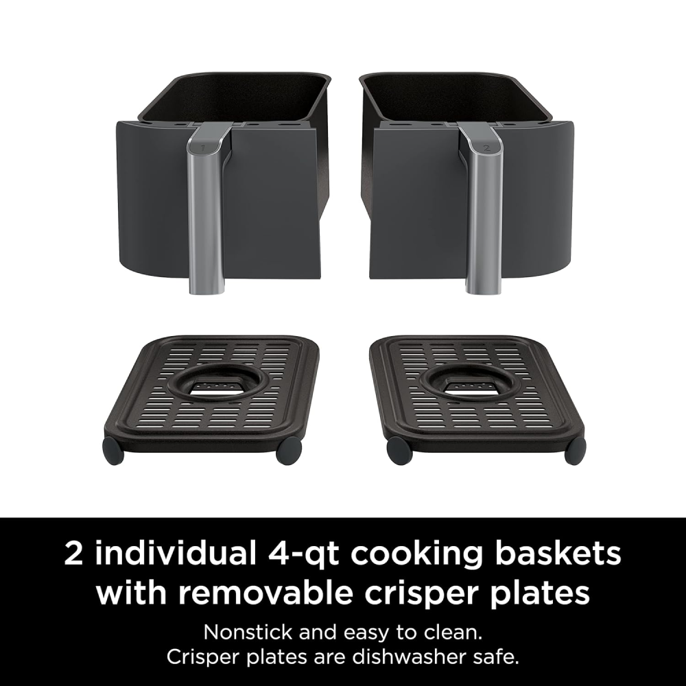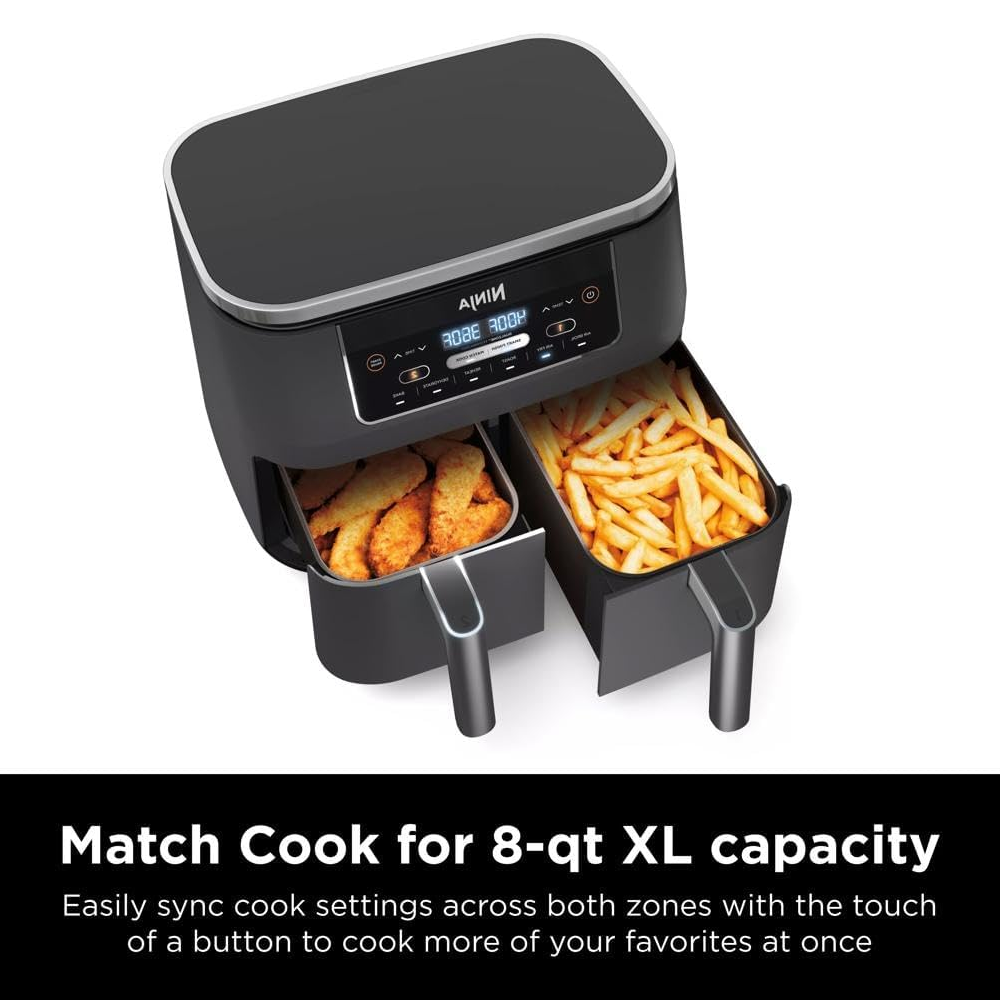 - SMART FINISH & MATCH COOK: DualZone Technology allows you to choose between the Smart Finish feature, which unlocks cooking 2 foods 2 ways that finish at the same time, and the and a Match Cook button to easily copy settings across zones for full 8-qt capacity.