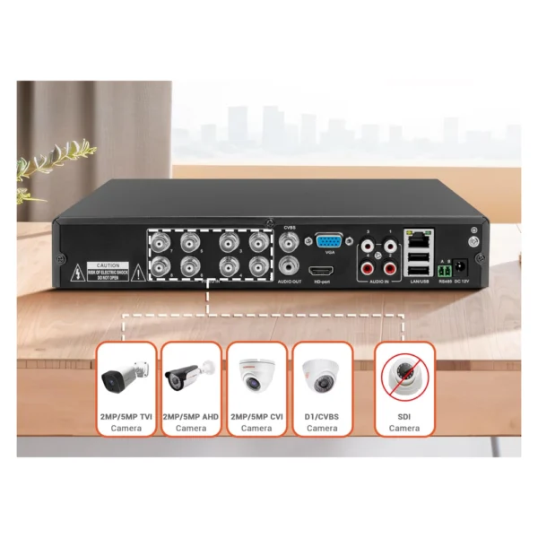 1. This DVR is compatible with 2MP/5MP HD TVI, AHD, CVI, RS485 PTZ cameras and analog security cameras. For optimal performance, use this TIGERSECU DVR with TIGERSECU security cameras.