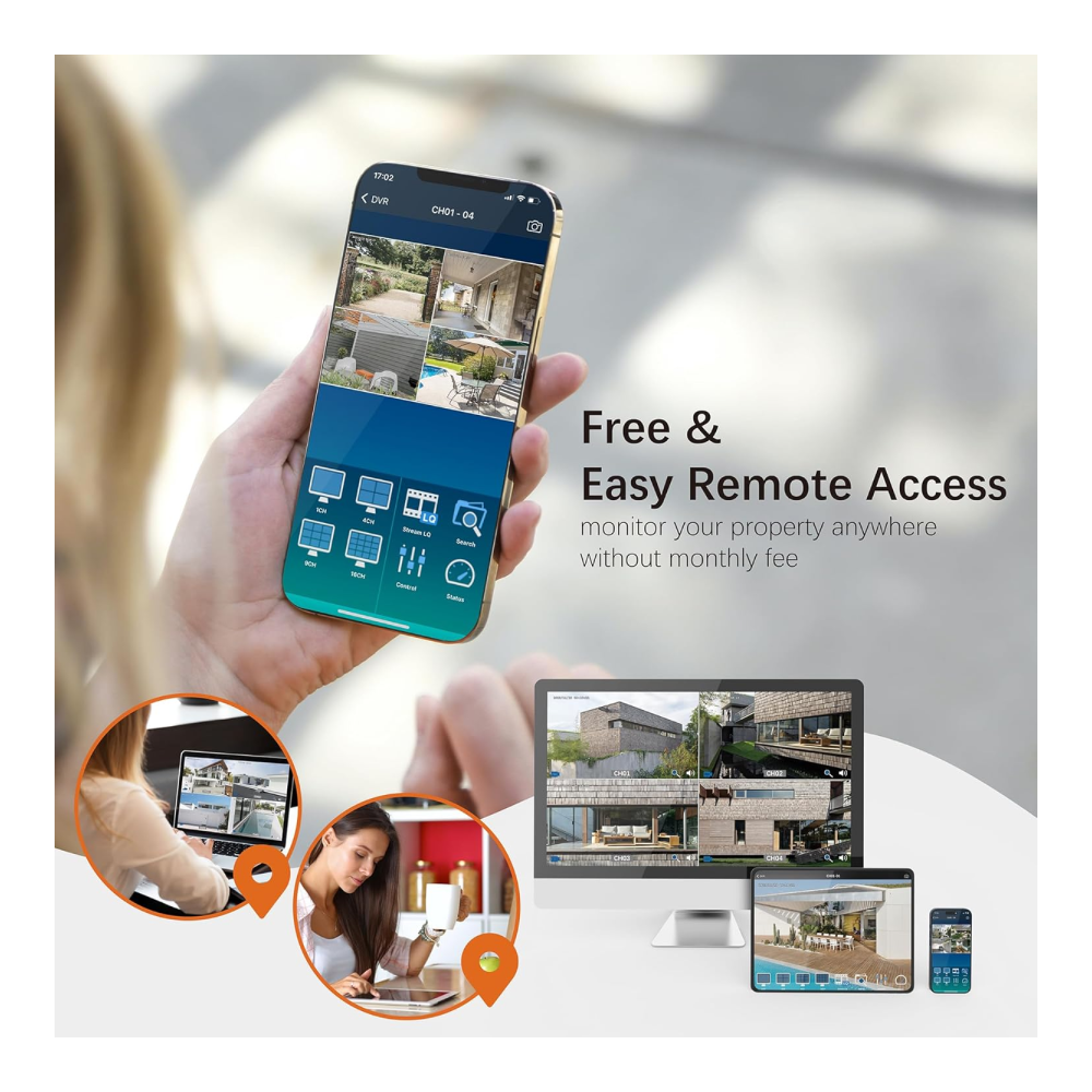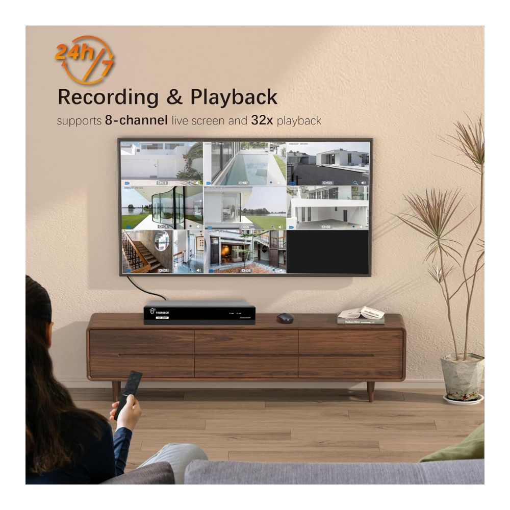 2. Remotely access and play surveillance footage and control the security DVR with no contract or monthly fees with TIGERSECU’s HD Viewer. For optimal performance, 1 Mbps network upload speed is recommended for each 1080P camera. Bitrate settings can be adjusted in the DVR to accommodate slower network speeds. Mobile app requires iOS 9.3 or later and Android 9 or later.