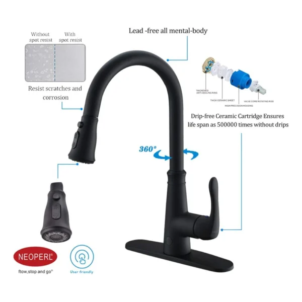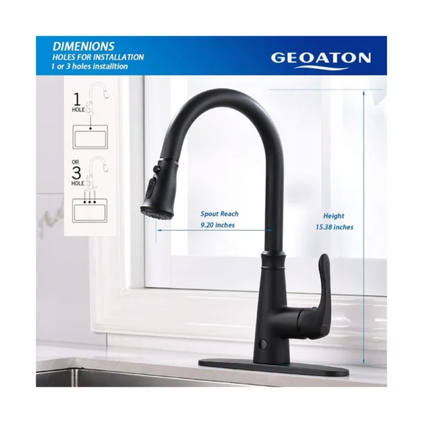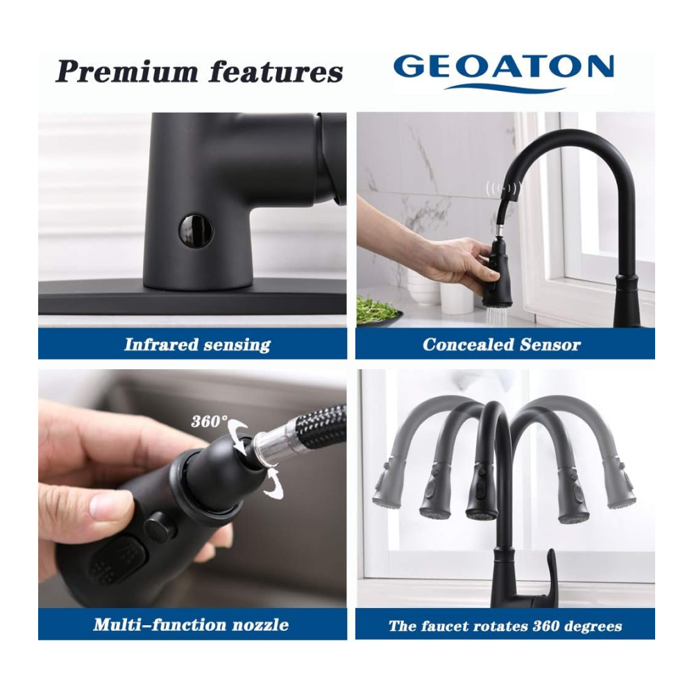 | Special Feature | 1.HEALTHY : GEOATON is a truly healthy faucet, for the family, for the wife and children1.GEOATON faucet is committed to providing you and your family with healthy drinking water and has invested heavily in the development of a patented tap heart that has no lead content at all and the same appearance but different quality. Choose GEOATON for health., 2.DUAL MOTION SENSOR FUNCTION Motion Infrared Sensor Delivers Exceptional Hands-Free Touchless Convenience. Pull the faucet head down to automatically eject and release to shut off the water as soon as the head is retracted to its original position., 3.EASY TO INSTALL – engineers have integrated all hoses together, no plumber required, DIY installation is less than 20 minutes, this product comes with a 10-inch deck, fits into 3 kitchen tap holes, and easily matches most sinks, 4.Easy to operate — fashionable design single handle easy to control water temperature and flow, 360 degree nozzle rotation can be achieved multi-functional full range of cleaning channels,(Road spray setting(STREAM,SPRAY,PAUSE), are set to flow for irrigation, spray for rinsing, pause in multi-task mode to avoid spatter) and always recycle to the nozzle with each use., 5. EXTRA lONG SUPPOR – we offer 100% refund guarantee within 100 days, 360 return or exchange without reason, please feel free to purchase GEOATON. |