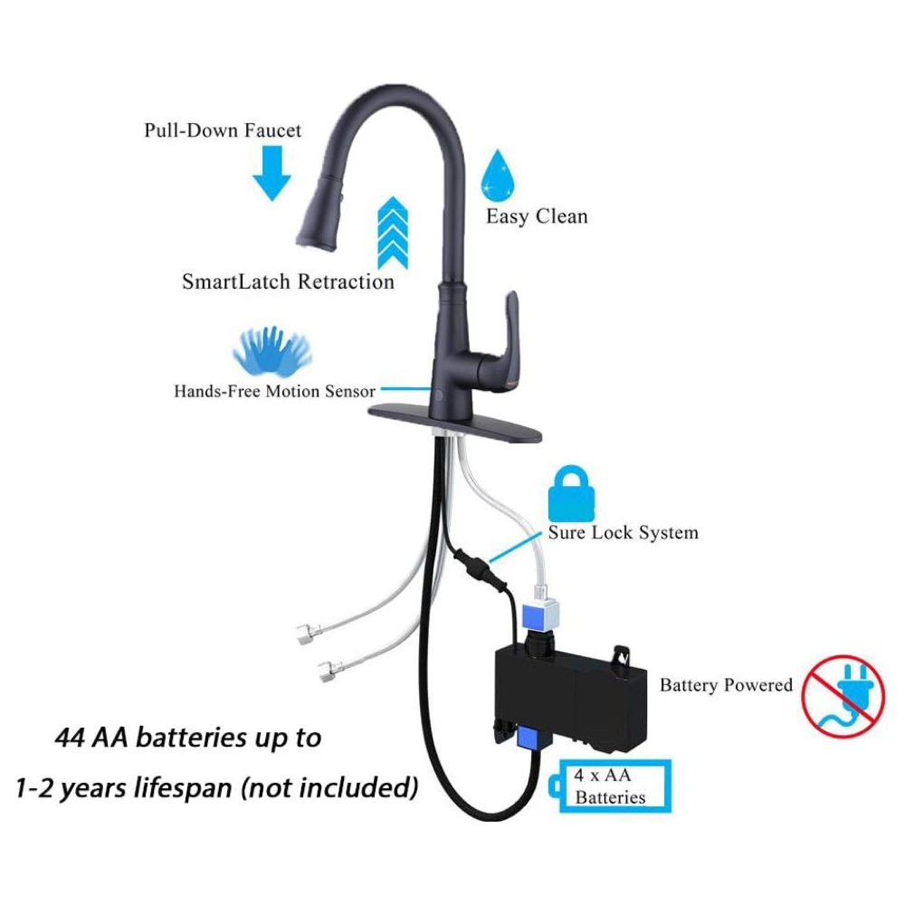 - 2. DUAL MOTION SENSOR FUNCTION:Motion Infrared Sensor Delivers Exceptional Hands-Free Touchless Convenience. Pull the faucet head down to automatically eject and release to shut off the water as soon as the head is retracted to its original position.